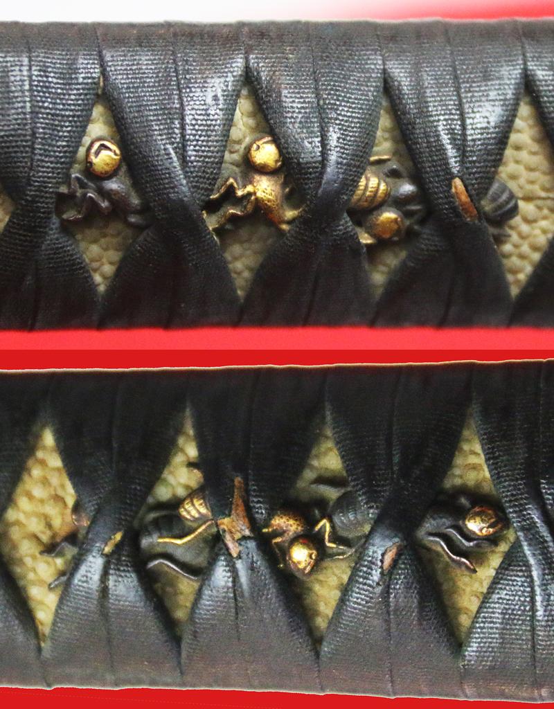 It has a very rare menuki of suzumebachi, giant hornets Vespa madarina Japonica, in pure gold overlay and shakudo, a subspecies of the world's largest hornet, with a wingspan of 2.4 inches. Giant hornets give spiritual protection for the sword. Stunning tsuba of a large tetsu ovoid plate tsuba with takebori dragonfly with gold legs, and crickets with gold antennae. Fuchi kashira in tetsu with silver inlays of vine tendrils.
