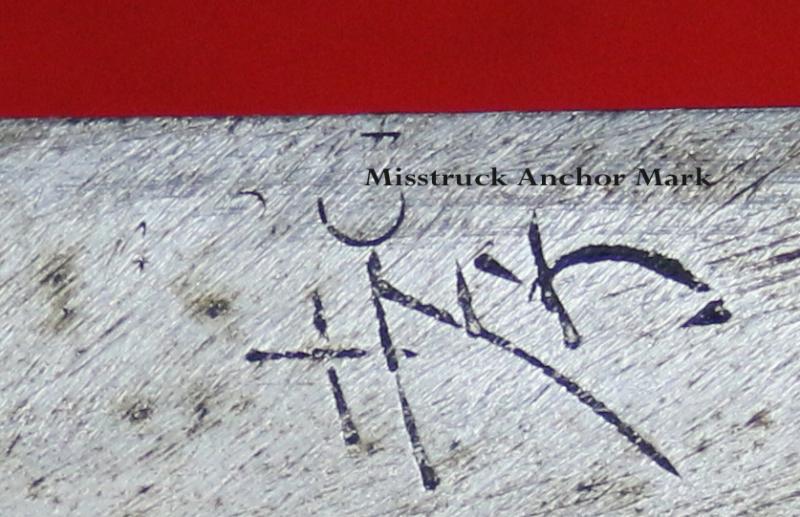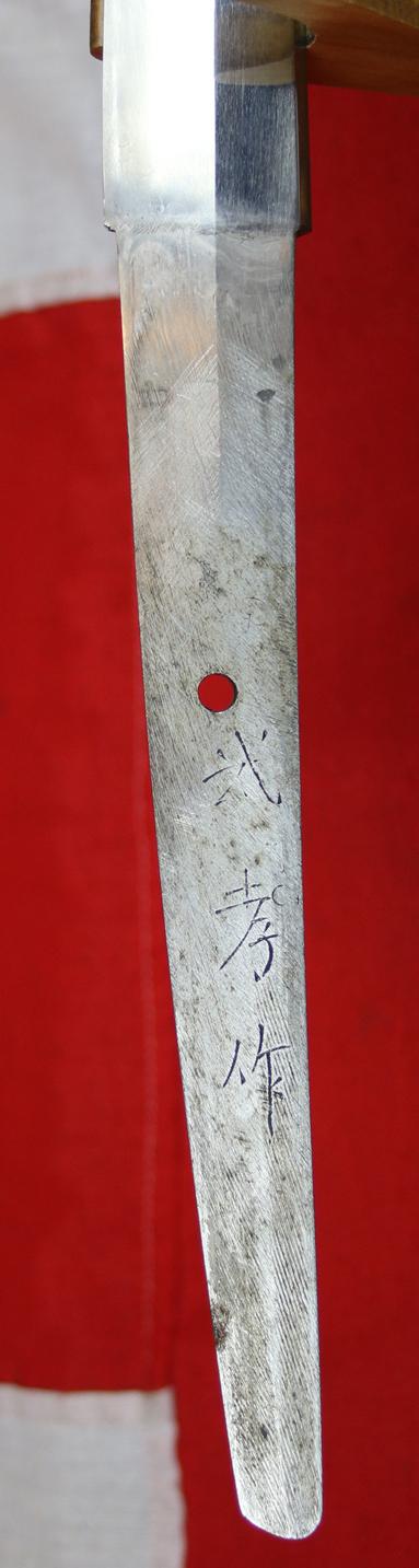 Blade length is 27.25 inches and overall length 39 inches. It has a super blade, with one mounting hole in the standard tang, which has an asymmetrically rounded (haagari) tang tip. The tang itself is marked a partially visible ( obviously lightly struck) Naval anchor stamp, possibly indicating manufacture at Toyokawa Naval Arsenal (豊川海軍工廠, Toyokawa kaigun kōshō). However, it also bears a signature mei, {probably Takekata saku, Takekata made this} something we usually don't see on these blades.