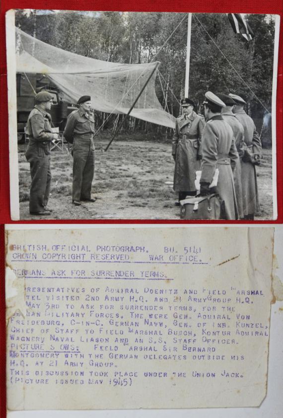 See our original official photograph from this special and monumentally important historical event, taken on the 3rd of May 1945. It is of Field Marshal Montgomery, Admiral von Friedeburg, General Kinzel and Rear Admiral Wagner plus aides .The unconditional surrender was not ‘officially signed until a few days later as Stalin insisted his generals must be present. Overall this sword is in excellent condition.