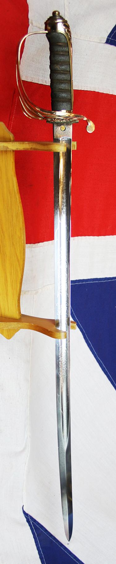 Traditional gilt hilt of Gothic form, pierced with Queen Victoria's cypher, a very fine deluxe etched finest bespoke made blade, and gilt brass scabbard, that denotes the owner to be of 'field rank' that is for the use of Majors, Colonels, Brigadiers and above whilst serving within the British Infantry. More photos to add later today.