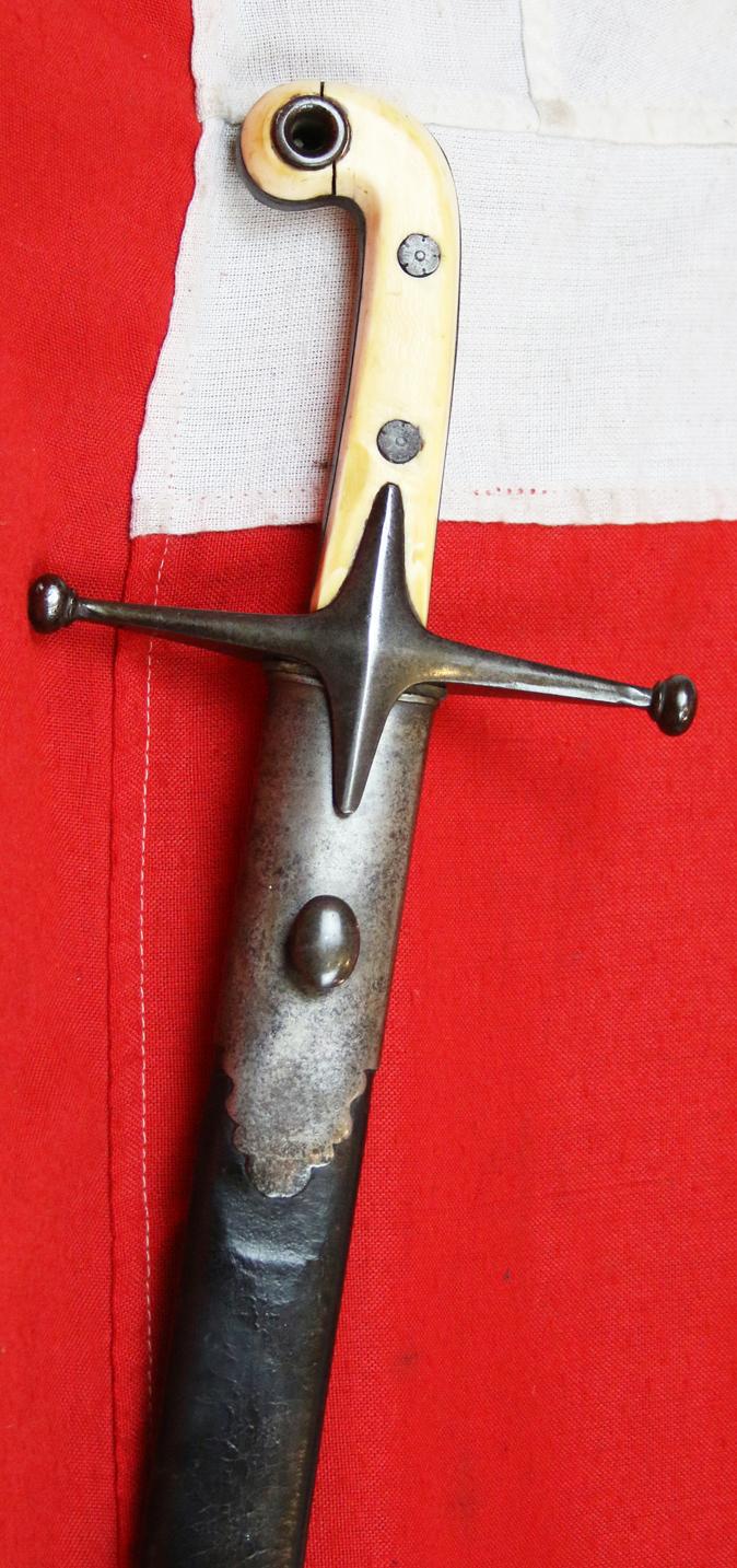 All the steel mounts are very good, the hilt ivory is also good with a small north south crack at the pommel area. The leather is good and with a thumb print size bruise to the surface around 2/3rd the way down the scabbard. No scabbard seam stitching present at the reverse side.