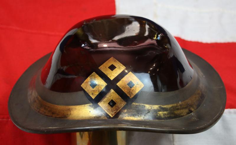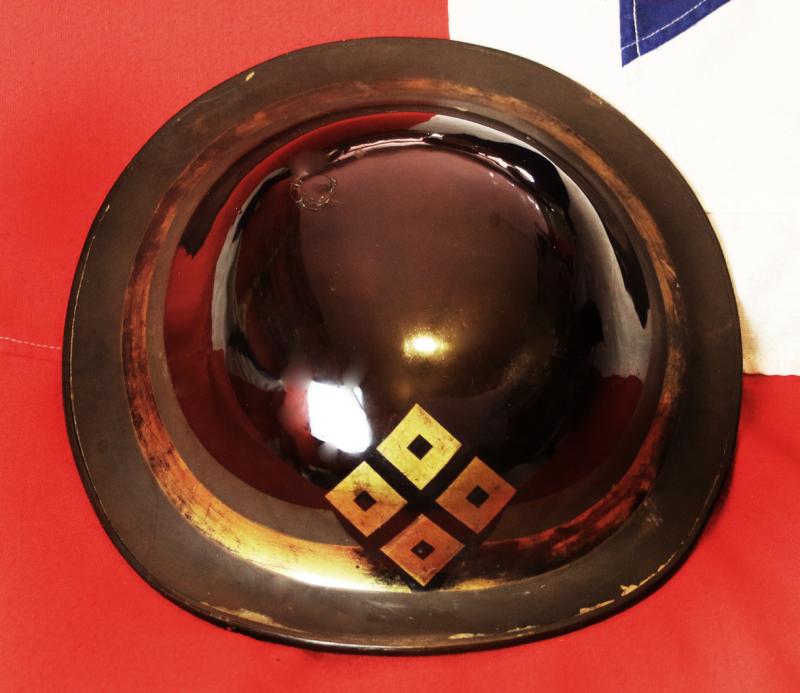 Edo period original jingasa of the Kamei clan. in black urushi lacquer, large gold Kamei mon, and two ishime stone finish lacquer bands, either side of a gilt band. Some interior padding present
